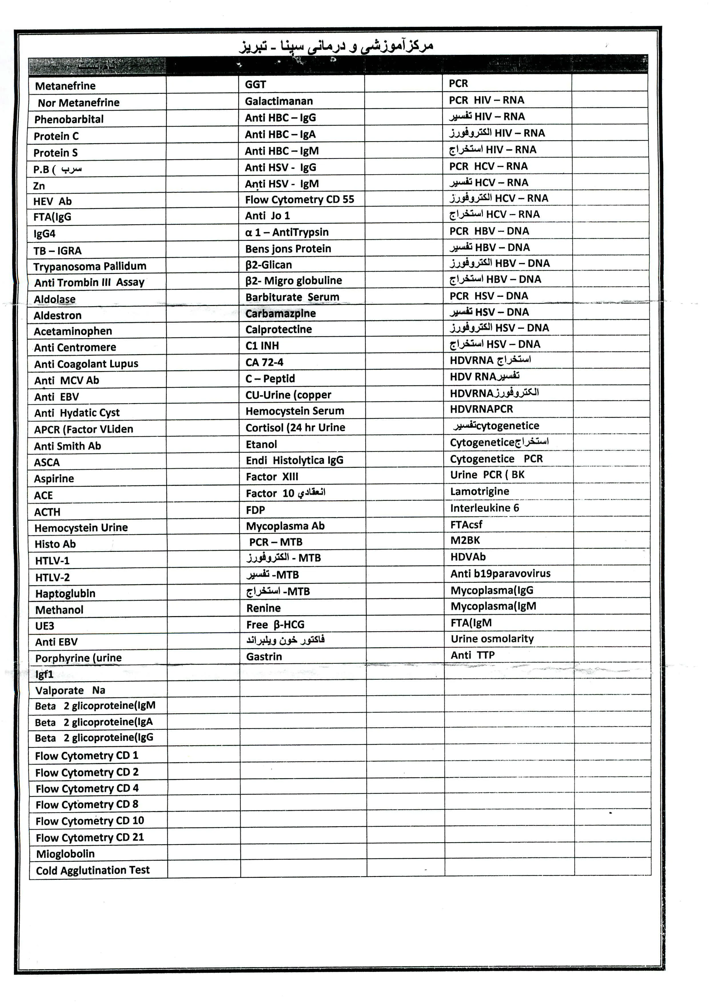 استعلام قیمت تعدادی از آزمایشات جهت همکاری با آزمایشگاههای تبریز