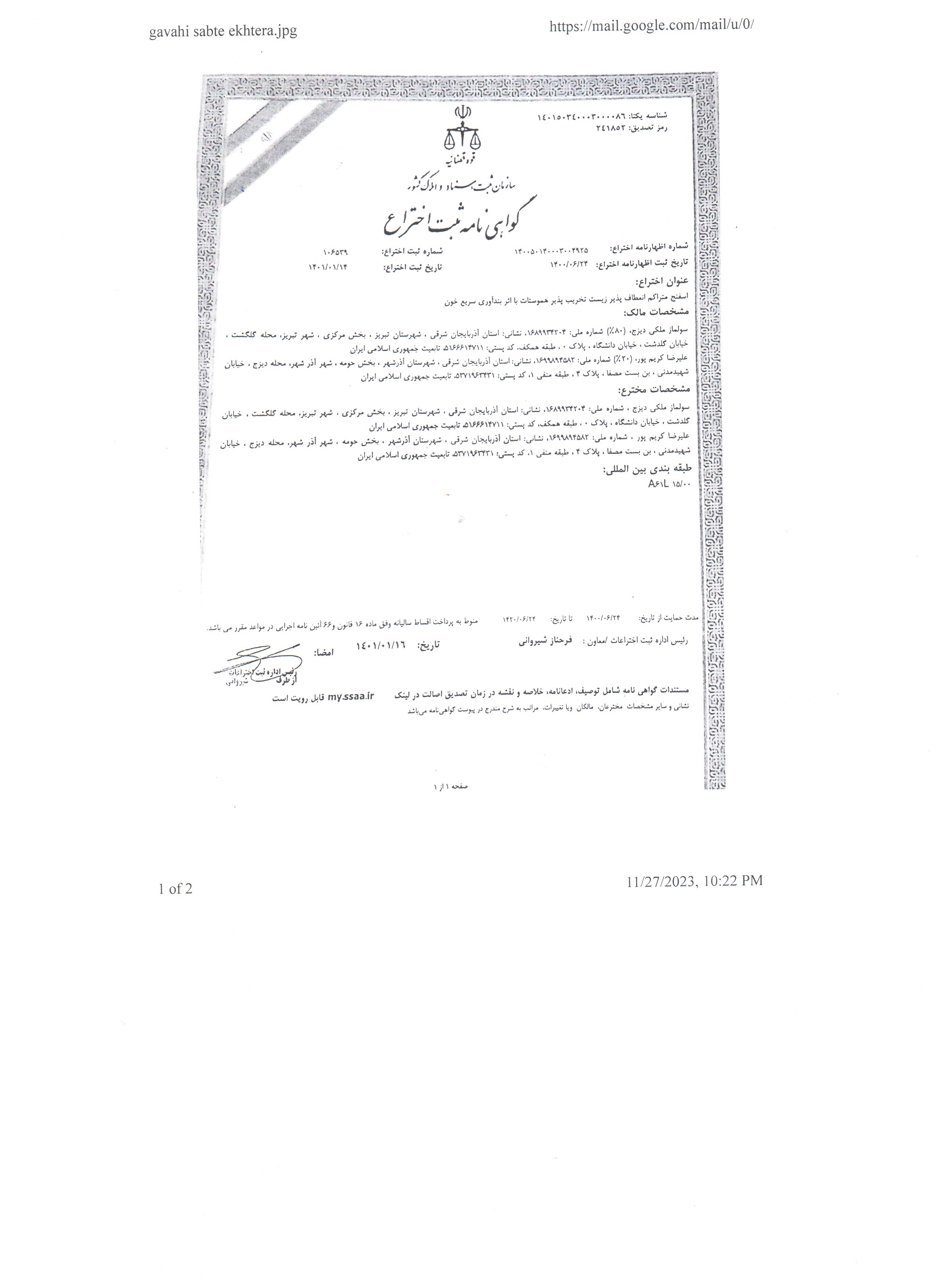 | اختراع ثبت شده سرکار خانم دکتر سولماز ملکی دیزج | فایل شماره یک |