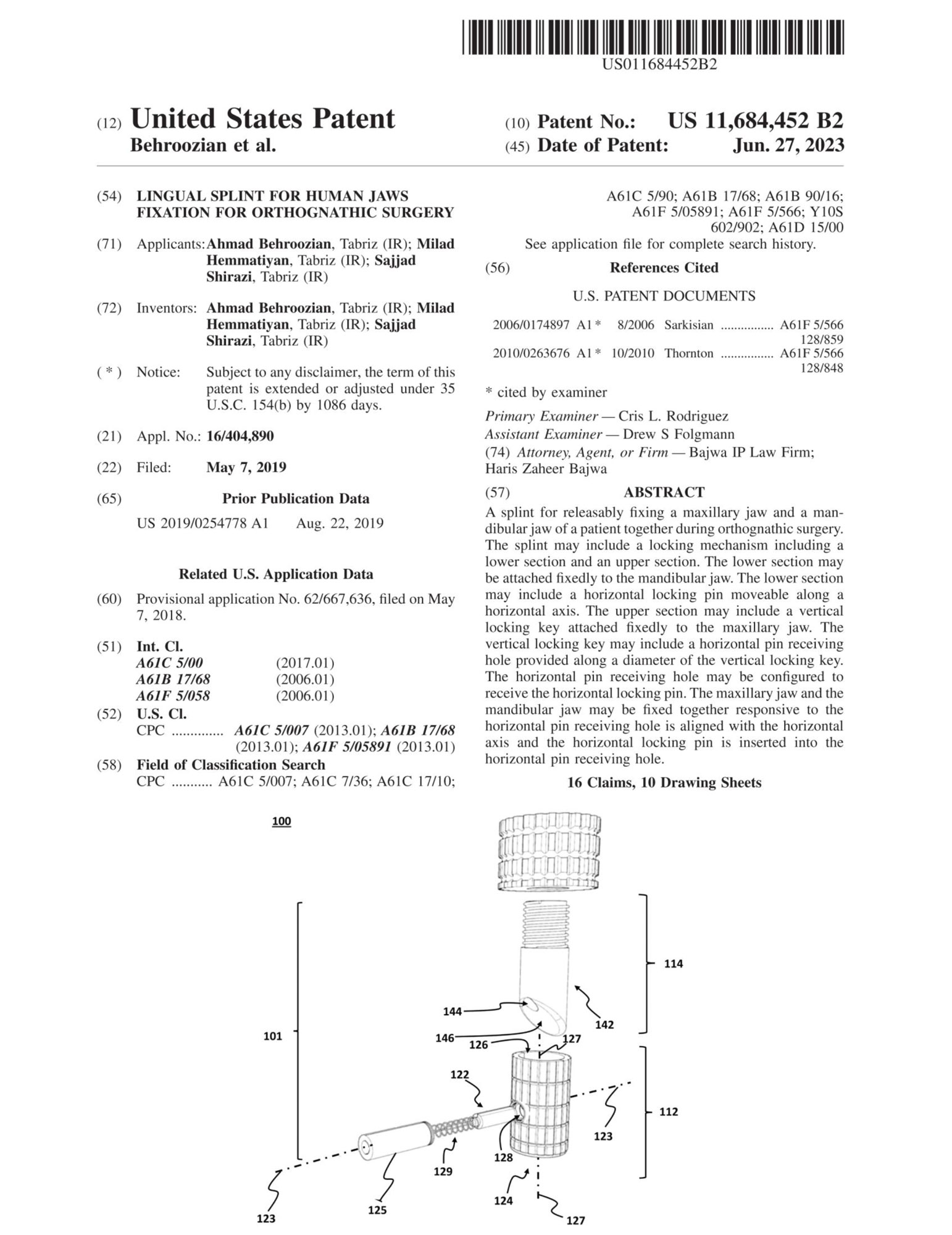 اداره ثبت اختراعات آمریکا | دکتر احمد بهروزیان- میلاد همتیان-دکتر سجاد شیرازی | Lingual splint for human jaws fixation for orthognathic surgery | 2 |